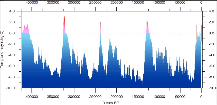 As you can see from this, the ice ages last about 120,000 years.[2]And then we have a warm period lasting about 12,000 years, or plus, minus. And not all the warm periods are the same, mostly they just go like this and move back down. But our period has already lasted longer than the others. And we have this zigzag pattern instead. Or in human language: Our warm period is a bit cooler, and also was made up of several small Ice Ages. The big ice age is coming, this is the period we are entering. And all these climate changes that we see today, that people claim that "It's the evil white man's fault." They can be explained by this. They are in the changeover period and going back to the ice age.